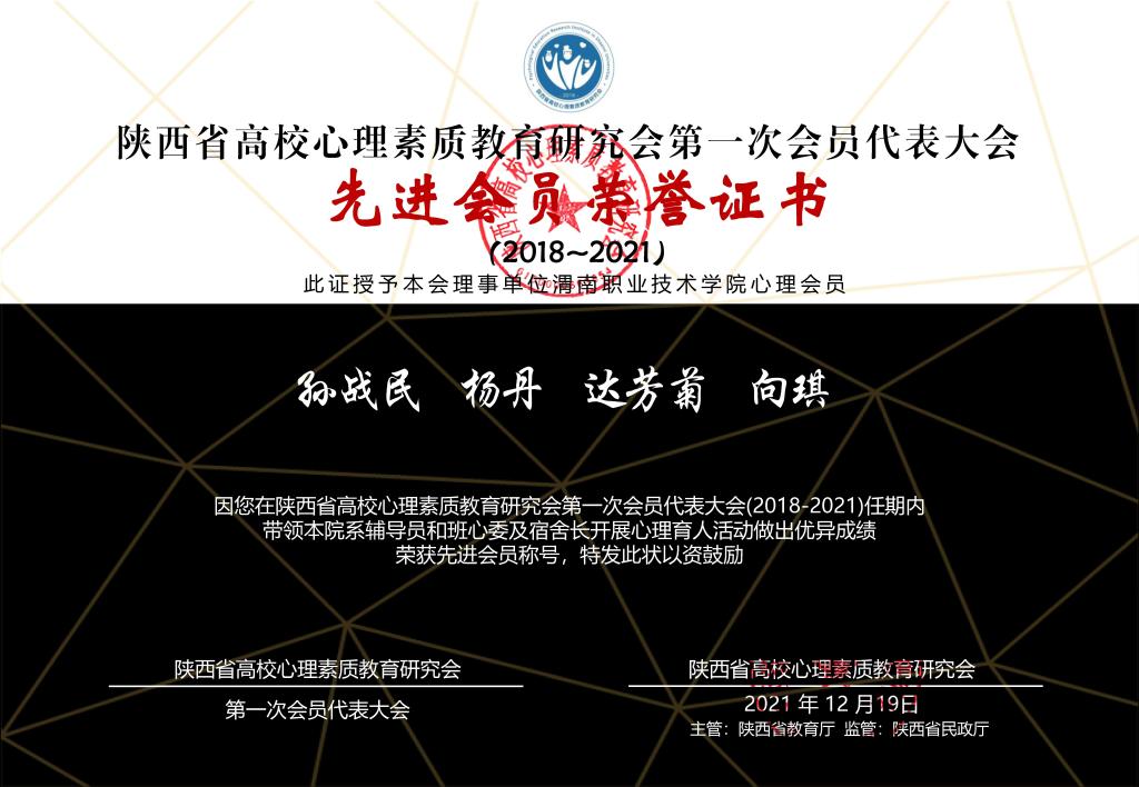 近日,省高校心理素质教育研究会对理事单位心理育人工作成就进行了表彰,买球官网达芳菊教授、向琪副教授两位老师荣获“先进会员”荣誉称号。向琪老师还荣获“2021年度陕西省高校十佳心理师提名”荣誉称号。