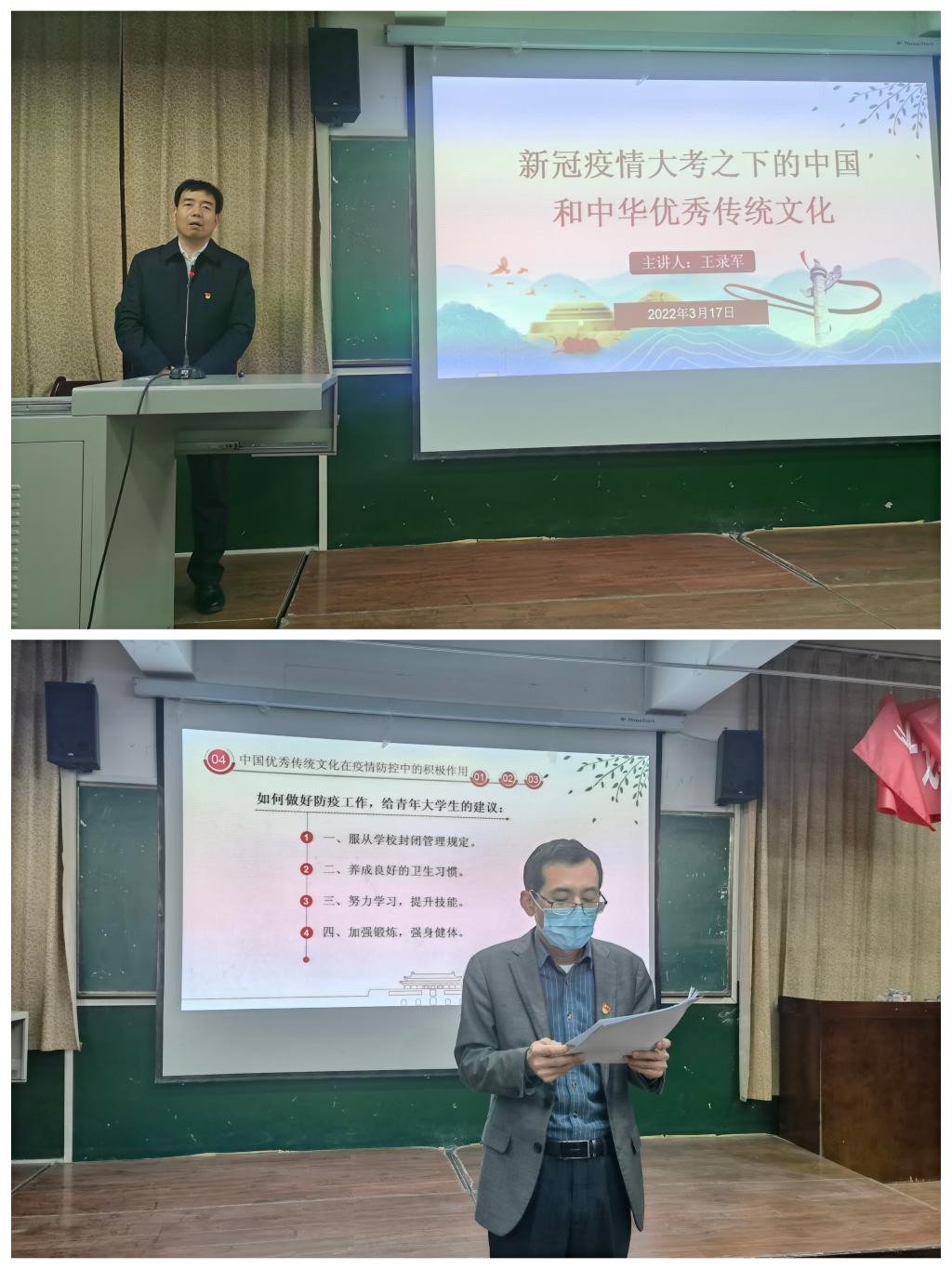 为统一全校学生思想,让青年学生“知晓各国抗疫大势,增强自觉抗疫意识,争做抗疫防疫战士”,全校青年学生同上“抗疫”思政大课拉开帷幕。3月16日至17日晚,学校党委副书记党少平、王录军,副院长王韦华分别深入师范学院、护理学院和机电工程学院,利用晚自习时间以主题班会的形式,围绕“疫情大考下的中国和中华优秀传统文化”这一主题与青年学生探讨交流。