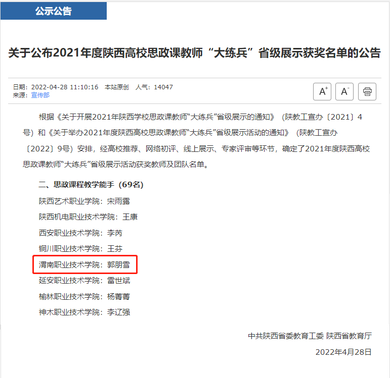 4月28日上午,陕西省委教育工委、省教育厅联合公布了《关于2021年陕西高校思政课教师‘大练兵’省级展示获奖名单的公告》,买球官网外围买球的app十大平台青年骨干教师郭朋雪获思政课程教学能手荣誉称号。