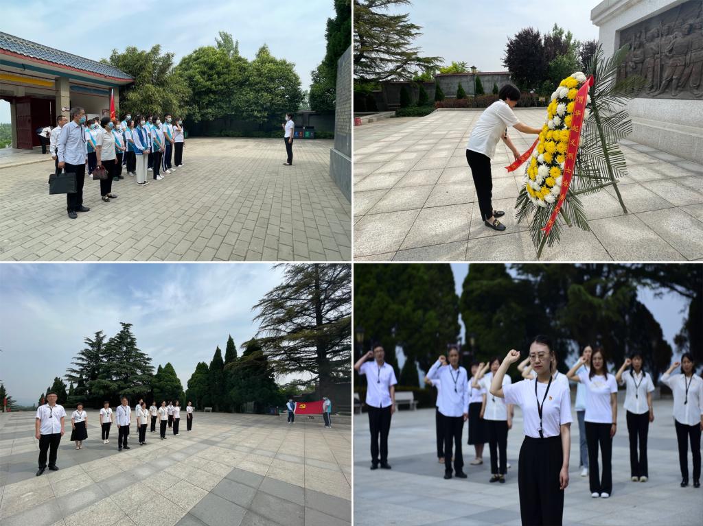 跟随着讲解员的脚步,全体人员首先来到了革命烈士纪念碑前,向革命先烈敬献了花篮,院长史改侠为花篮整理了挽带,全体人员向革命烈士三鞠躬,表达了对革命烈士的深切缅怀。在支部组织委员刘晓丹同志的带领下,全体党员同志面向党旗进行庄严宣誓,重温入党誓词,时刻铭记共产党员的初心和使命。