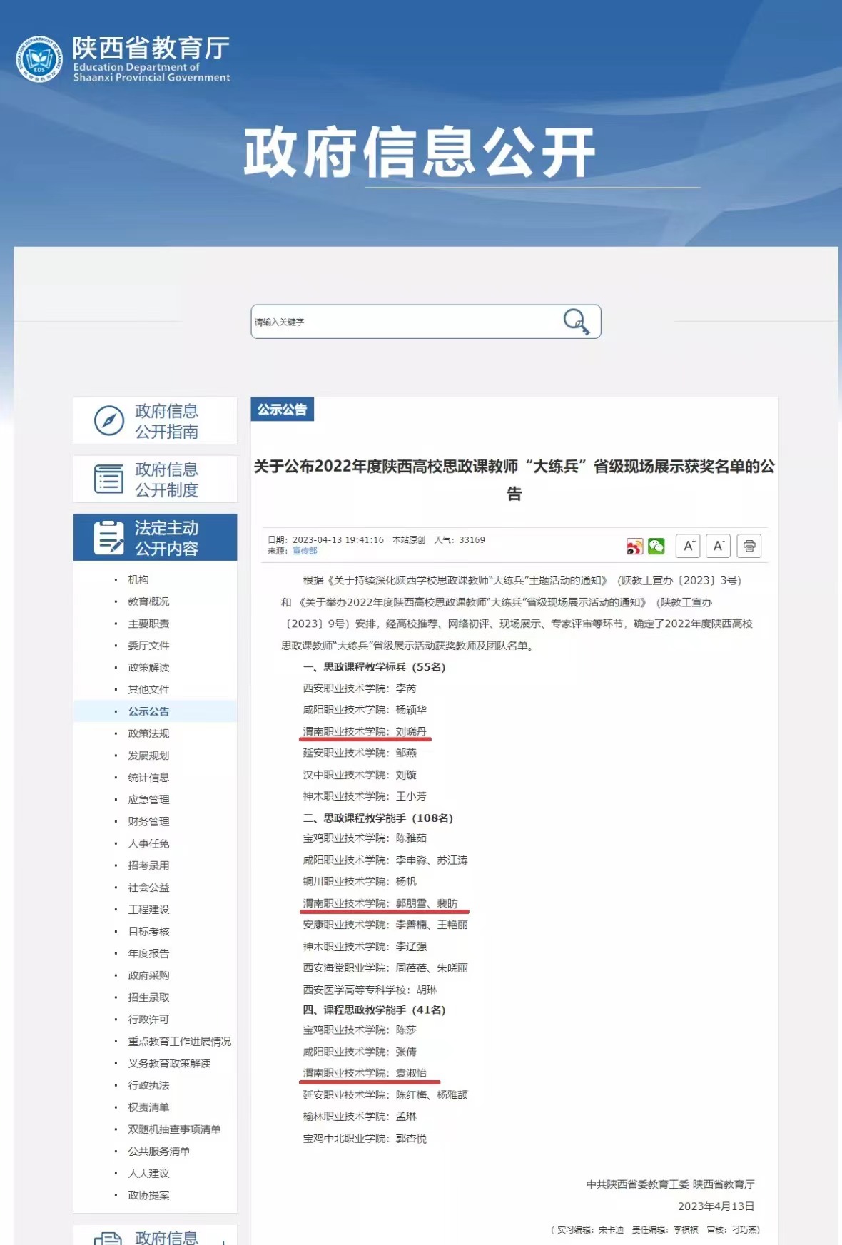 4月13日,陕西省委教育工委、省教育厅联合公布了《关于2022年度陕西高校思政课教师“大练兵”省级现场展示获奖名单》,买球官网外围买球的app十大平台青年骨干教师刘晓丹、郭朋雪老师分别荣获思政课程“教学标兵”和“教学能手”荣誉称号,师范学院裴昉老师获“教学能手”荣誉称号,医学院袁淑怡老师获课程思政“教学能手”荣誉称号。