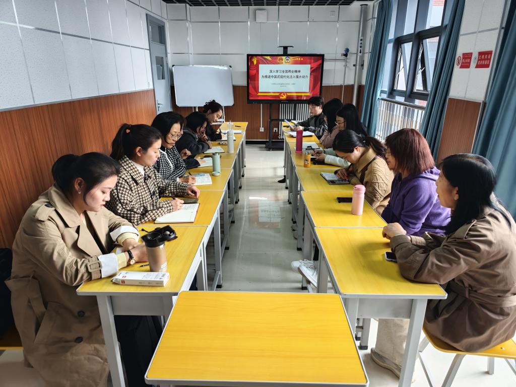会上,支部书记王晓莉以“深入学习全国两会精神为推进中国式现代化注入强大动力”为题,从会议基本情况、习近平总书记重要讲话精神、政府工作报告三个方面向全体党员宣讲全国两会精神。她指出,一年一度的“两会”是全国人民政治生活中的大事,要全面把握全国两会的鲜明特点和重大意义,准确把握习近平总书记重要讲话精神的主要内容和基本要求,要将因地制宜发展新质生产力、打好关键核心技术攻坚战、加强生态环境保护、全面提升新兴领域战略能力等内容融入思政课堂,引导他们主动关心、自觉参与国家与社会的发展。