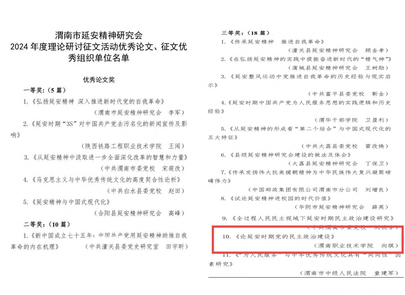 为深入学习贯彻落实党的二十届三中全会精神,加强买球官网教师理论研究工作能力,今年4月,买球官网组织教师积极参与申报渭南市延安精神研究会在全市发起的2024年度理论研讨会征文活动。本次共征集文稿266篇,评出一等奖论文5篇、二等奖论文10篇、三等奖论文18篇、优秀奖论文15篇,征文优秀组织单位4个。买球官网教师向琪副教授撰写的《论延安时期党的民主政治建设》获三等奖好成绩。