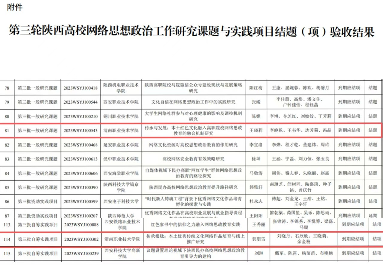 近日,中共陕西省委教育工作委员会公布第三轮陕西高校网络思想政治工作研究课题与实践项目结题(项)验收结果,买球官网王晓莉副教授主持的研究课题“传承与发展:本土红色文化融入高职院校网络思政教育的融合机制研究”、郭朋雪老师主持的自筹实践项目 “传承根脉:本土优秀传统文化网络作品培育与线上推广研究”均顺利通过验收,成功结题(项)。